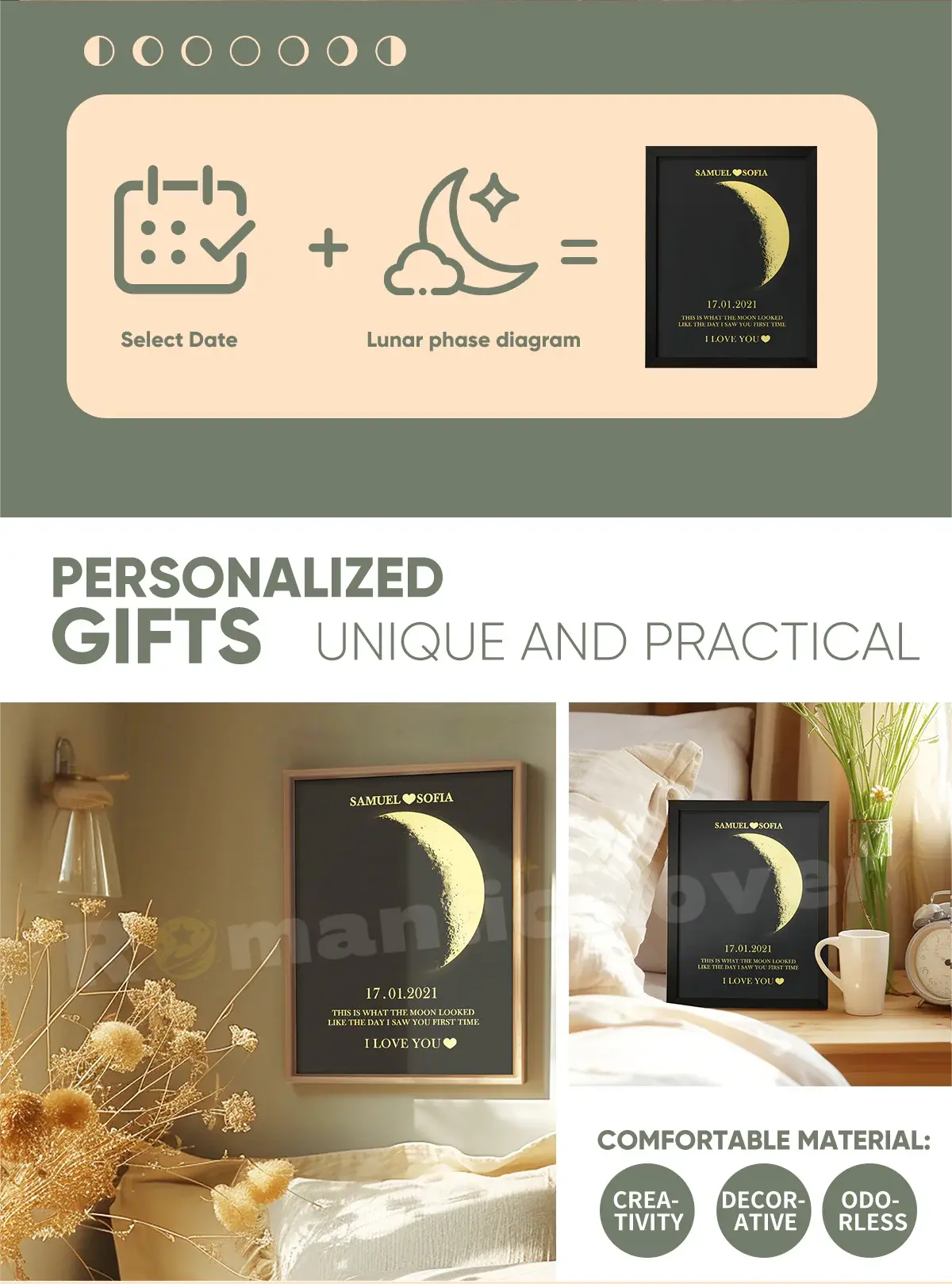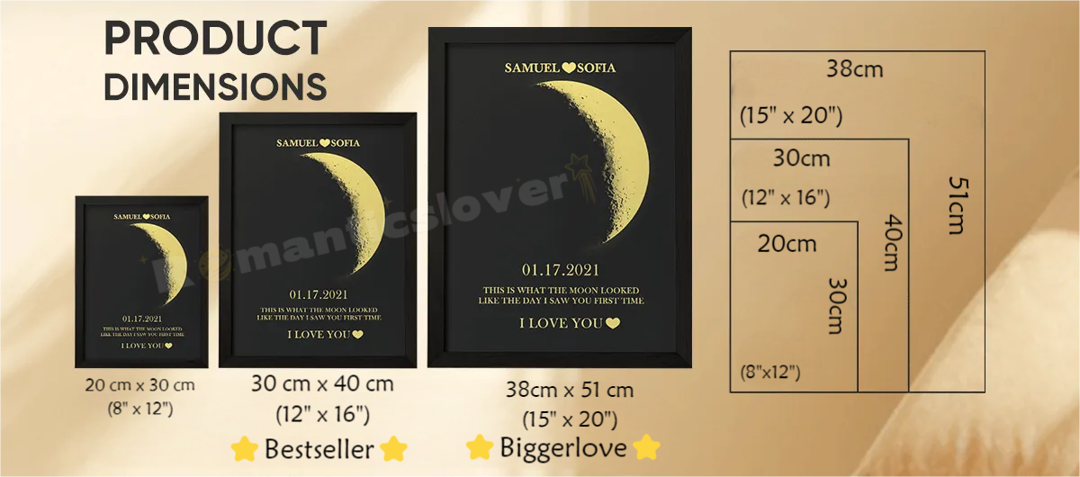 Let our customized couple's moon phase frame illuminate your love and create a keepsake that will last a lifetime. Our frames are more than just furniture pieces; they symbolize your love and testament to the depth of your connection.